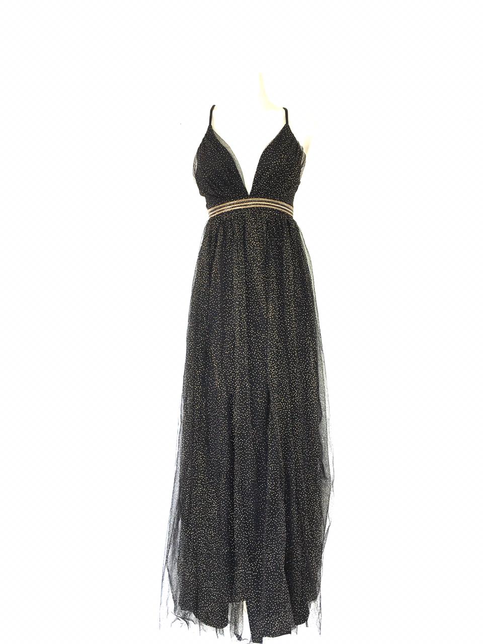 Vestido largo de tul negro con destellos dorados y escote profundo en V. Cintura empire con detalle metálico. Romántico y mágico, perfecto para galas y bodas de noche.